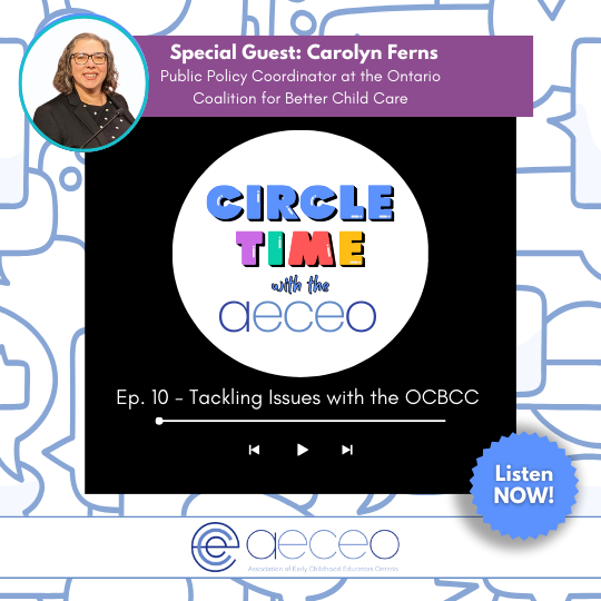 On this episode we hear from Carolyn Ferns, the Public Policy & Government relations Coordinator at the OCBCC. Carolyn shares her insights into the Ontario early learning & child care sector, and discusses how the AECEO and the OCBCC work together towards systemic change that will increase access to high quality ELCC services for Ontario families, and support ELCC workers with better working conditions and professional pay.
